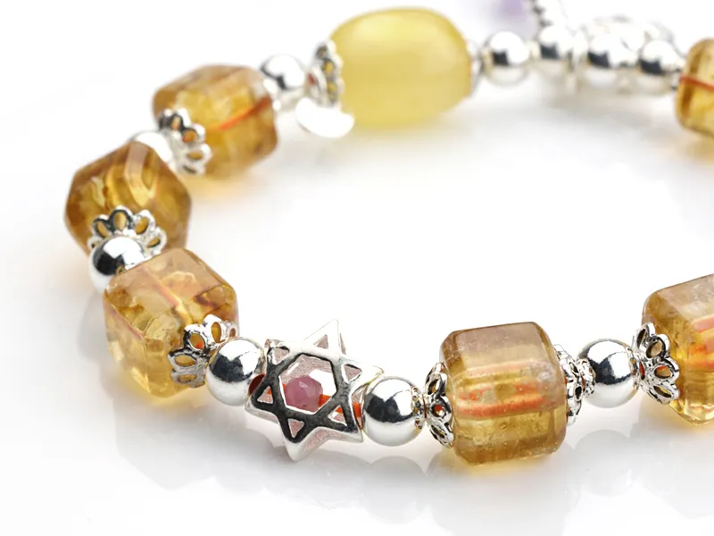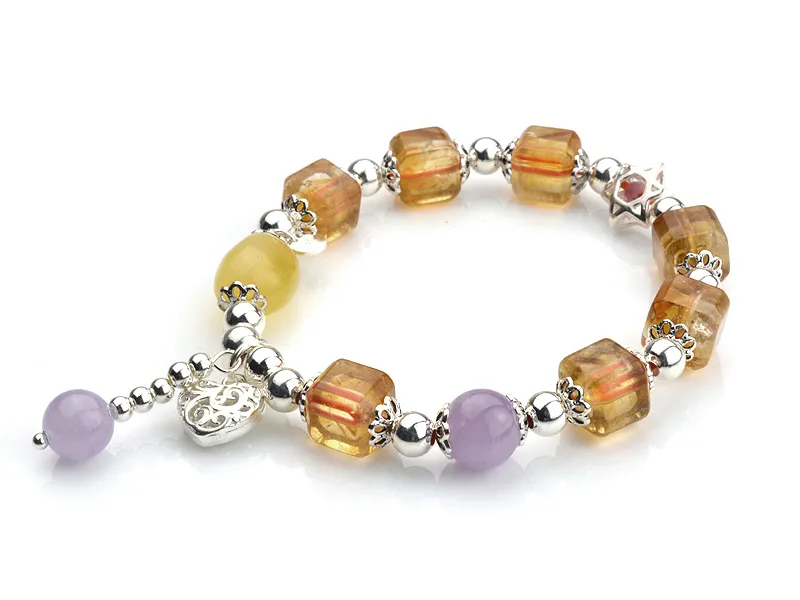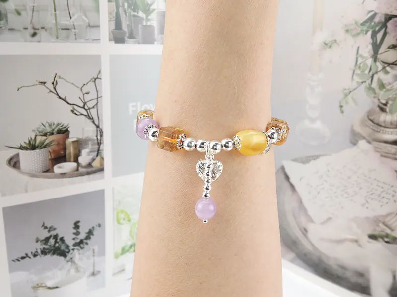商品說明:採用黃水晶搭配方糖工藝,幾顆薰衣草、蜜蠟點綴讓手鍊看氣來更仙氣,