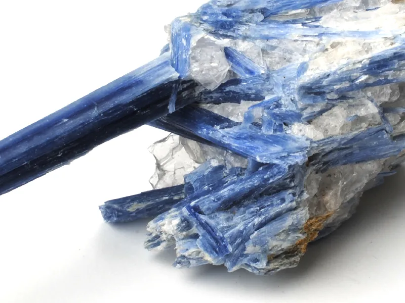 藍晶石屬三斜晶系,顏色呈藍色、綠色、黃色、灰色,晶體內的顏色分佈自然而不均勻。越高等級的藍晶石,色藍、體透、帶強烈的貓眼效應,而且雜色斑塊較少的更為罕有,色藍飽和度高為佳。
