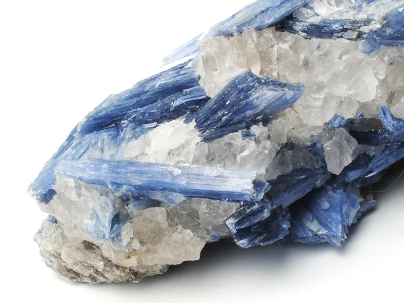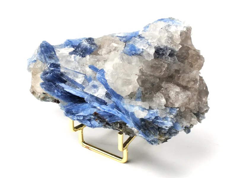 藍晶石屬三斜晶系,顏色呈藍色、綠色、黃色、灰色,晶體內的顏色分佈自然而不均勻。越高等級的藍晶石,色藍、體透、帶強烈的貓眼效應,而且雜色斑塊較少的更為罕有,色藍飽和度高為佳。
