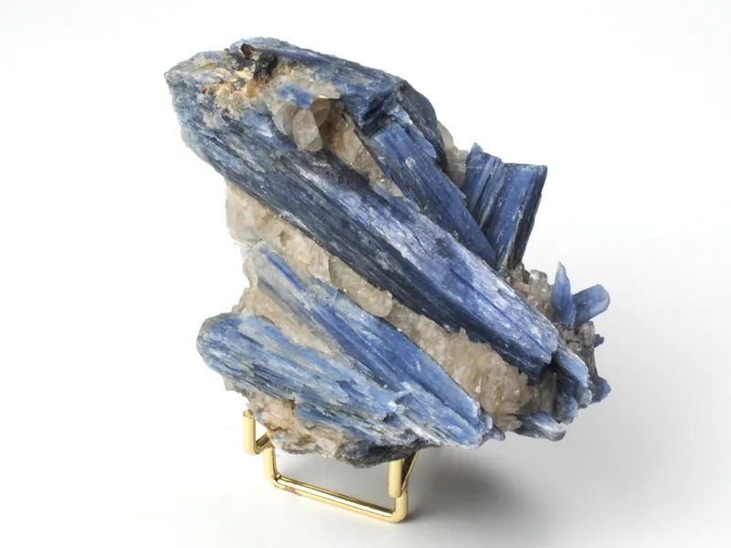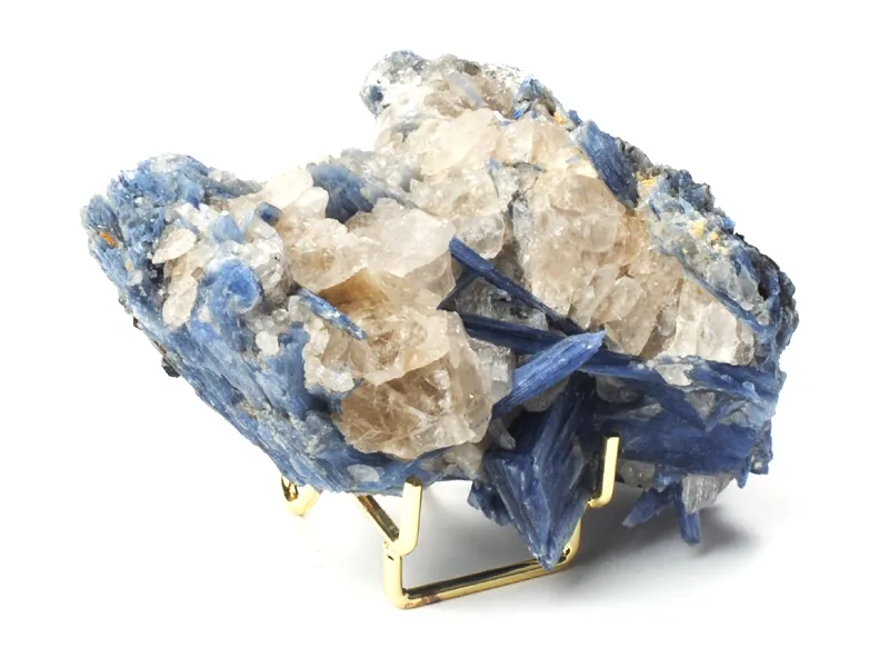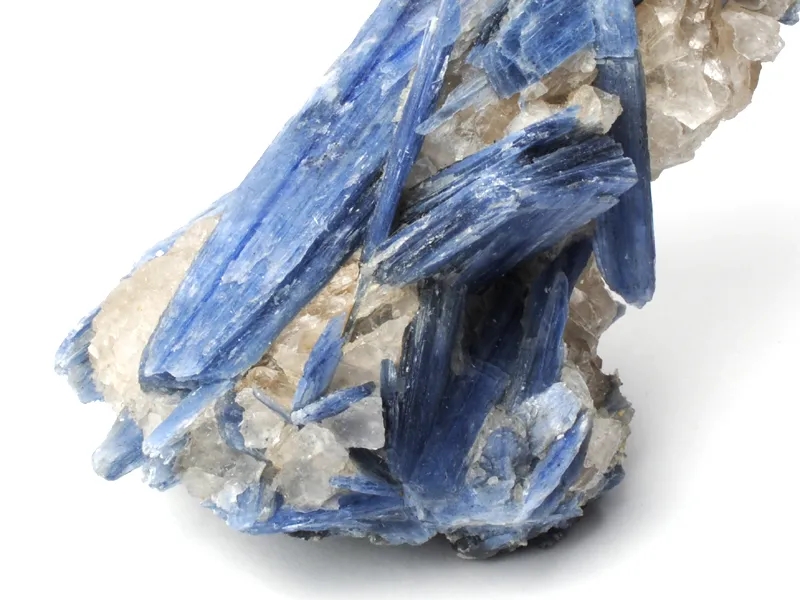 藍晶石屬三斜晶系,顏色呈藍色、綠色、黃色、灰色,晶體內的顏色分佈自然而不均勻。越高等級的藍晶石,色藍、體透、帶強烈的貓眼效應,而且雜色斑塊較少的更為罕有,色藍飽和度高為佳。